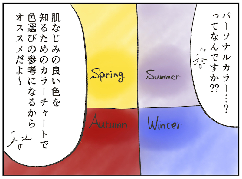 その中でもパーソナルカラーは一番わかりやすい”似合う”の指標です。すぐに調べられます。ざっくり寒色系が似合うのか暖色系が似合うのかわかるだけでも外見を整えるための手助けになるはずです。