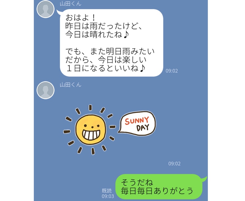 こちらの男性からは、毎日、天気予報のようにお天気のお知らせが送られてくるようです。おそらく、気になる女性にLINEを送りたいのに、話題が見つからないというだけだと思うのですが……でも、毎日続くとなると話は別。返答のバリエーションにも困ります。