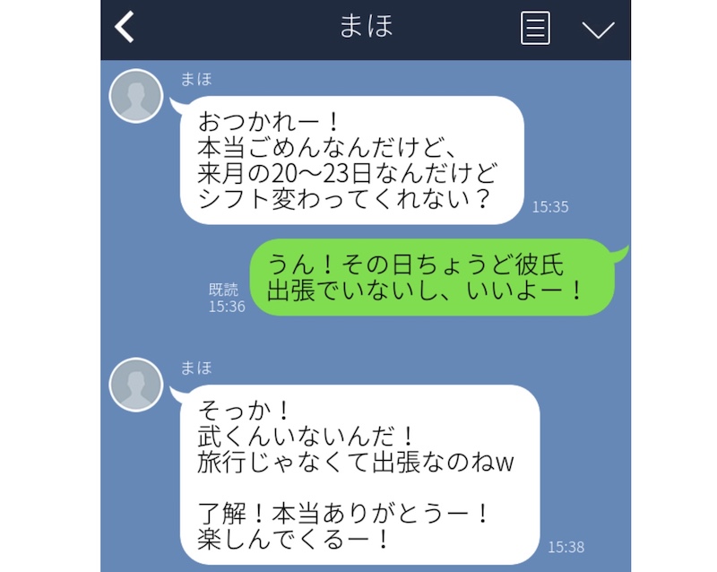 ただ、LINEの「旅行じゃなくて出張なのねw」という一文に違和感を感じた彼女。“女の勘”で彼氏の会社にこっそり問い合わせると、当日は出張の予定は入っておらず、休暇を申請していることが判明。そのことを彼氏に問いただすと、なんとシフトを代わってあげた女友達と浮気旅行を計画していたことが発覚!