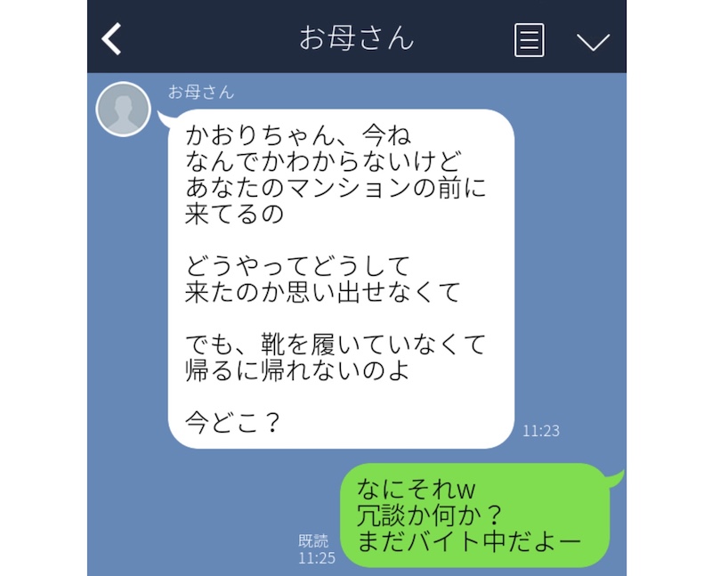 こちらのLINE、ある日、お母さんから一人暮らしの娘宛に届いたLINEだそうです。娘は近くでアルバイトをしていて、最初は冗談だと思ってスルーしようとしたそうなのですが、違和感を感じてもう一度連絡しました。