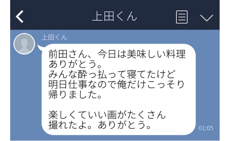 その後、ぐっすり熟睡していたところに届いたLINEがこちら。送り主は、この日に知り合ったばかりの男性でした。「いい画が撮れたよ」の一言に「どの画!? 見られていた!?」と恐怖しかなかったようです。