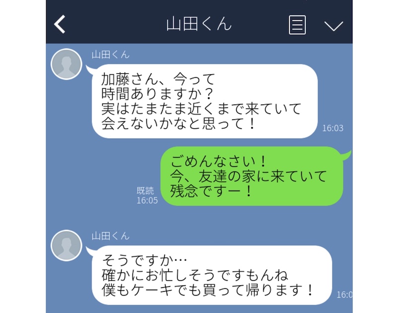 実際は、女友達が女性の家に遊びに来ていたのですが、このLINEの話をすると……その友達は慌てて、「男性が1人でケーキなんか買って帰る? しかも僕もって? もしかして、私たちが今ケーキを食べてるの見られてない!?」と。
