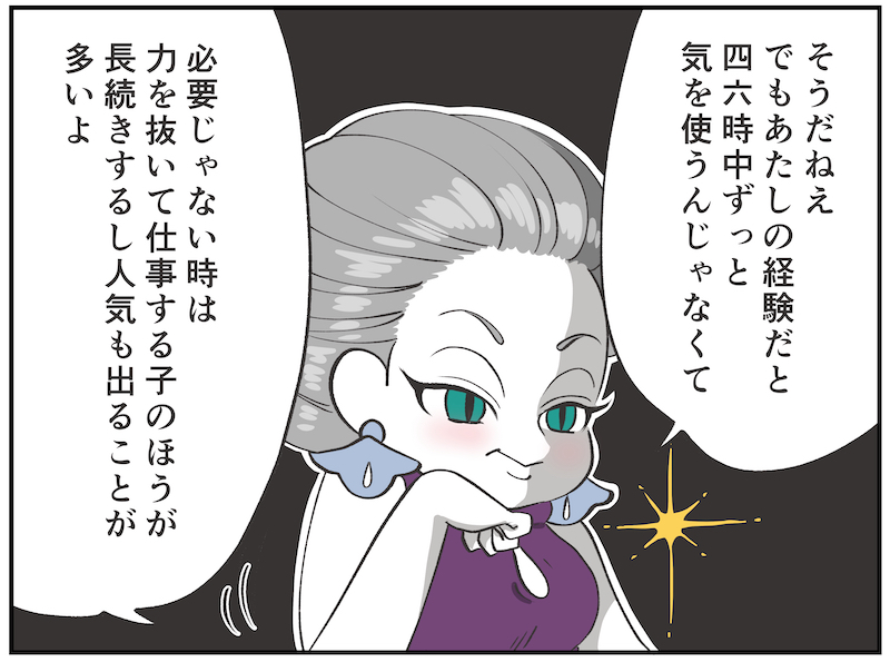 私は「鈍感力」だと思います。ここでいう鈍感とは、さっき言ったような水商売の基本のキができていないということではありません。「スルー力」と言い換えられるかもしれない、程よい「抜け感」のことです。