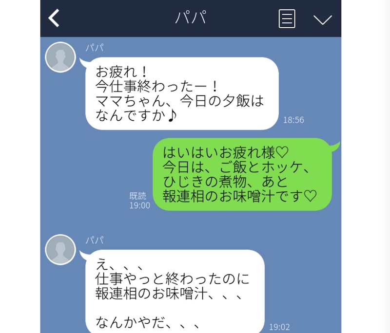 こちらは、とある仲良し夫婦のLINEでの会話。やっと仕事が終わった旦那さんが、奥さんに楽しみにしている夕飯のメニューを聞いています。それに対して「ほうれん草のお味噌汁」を「報連相のお味噌汁」と間違えて返信。