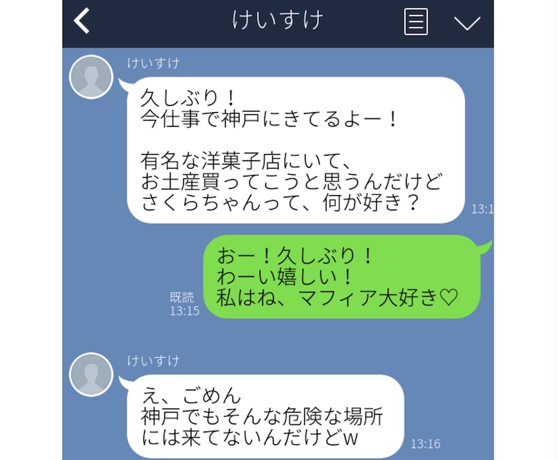 こちらは友人同士のLINEの内容。洋菓子で有名な神戸のお土産を買ってきてもらえるというので、「マフィン大好き」と送ったはずが、なんと「マフィア大好き!」になってしまいました。