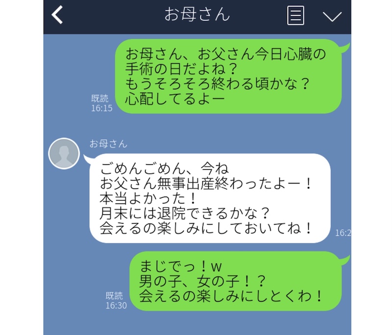 こちらは、親子の会話です。お父さんの心臓の手術が成功したか気になっている娘に対して、「無事出産終わったよ!」と、「手術」と「出産」を間違えて報告してしまったお母さん! なぜかわかりませんが、お父さんの出産シーンをリアルに連想してしまいました。