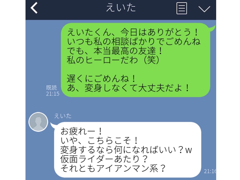 それに対しての男友達の返しが素敵ですね♡ その前の「私のヒーロー」に触発されたのかもしれません。見た目は人間でも、心は仮面ライダーやアイアンマンのように強く優しい心を持っているはずです♡