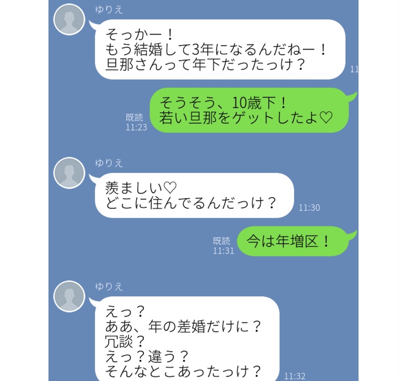 こちらの2人、久しぶりのLINEで会話を繰り広げていたところ、友達の“年の差婚”の話題になりました。その後、絶妙のタイミングで「豊島区」を間違えて「年増区」と入力。