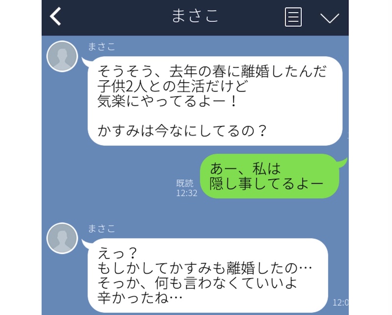 こちらの2人は、LINEで離婚の話題のやりとり。その後、友達に仕事を聞いたら、「書く仕事」が「隠し事」に変換されてしまったようです。
