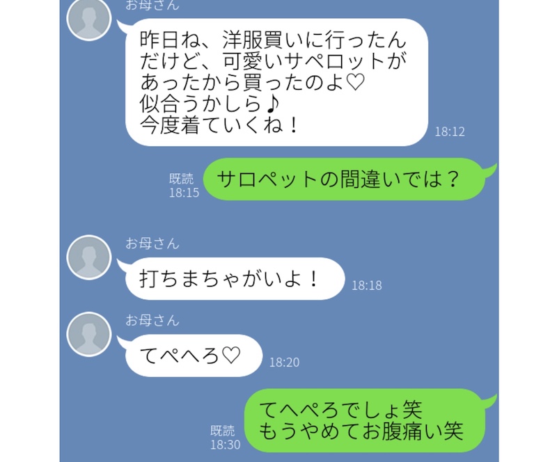 さらに、返信文も打ち間違えて、追い討ちをかけるように「てぺへろ」と入れてくる始末……。娘さんも、お母さんのボケのテンポ感が早すぎて、腹筋が崩壊しそうになっていますね。