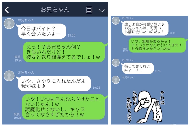 こちらのLINEでは、お兄ちゃんが彼女へのLINEを妹に誤送信。何がなんでも甘える姿なんて見せたくないため、苦肉の策で「我が妹に会いたい」なんて必死に悪あがきしている様子。きっと普段は、もっと違うキャラなのでしょう。