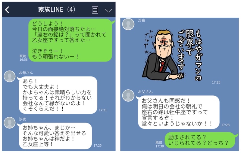 ノリがいい家族は、LINEの世界観が独特です。こちらのLINEでは、お姉ちゃんが「座右の銘」を聞かれて、「乙女座」と答えてしまったおもしろエピソードを暴露。落ち込んでいるお姉ちゃんを励ましているようにも見えますが、完全にいじられていますね!