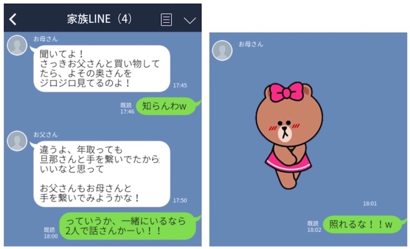 仲良し家族LINEのあるあるが、お父さんとお母さんの“おのろけトーク”。こちらの家族は、お母さんがよその奥さんを見つめていたお父さんに嫉妬していますが、結果的にお父さんは、お母さんと手をつなぎたかっただけのようです。