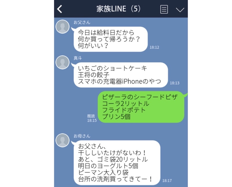 最後のあるあるは、たった一言でお父さんがネットスーパー化してしまうというもの。こちらのお父さんは、お給料日に家族に何かお土産を買って帰ろうと、意見を募りました。すると、お土産というより、まるで買い出しのように、それぞれが必要なものを羅列することに……。
