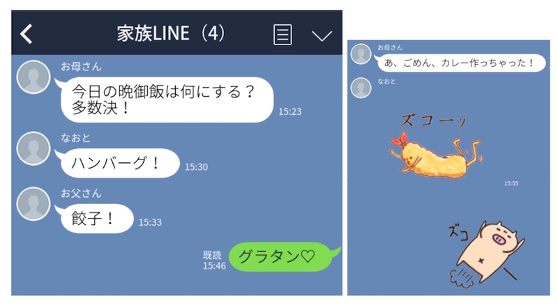 仲良し家族LINEでは、しばしば“晩ごはん会議”が開かれるようです。こちらの家族も、お母さんが多数決で晩ごはんのメニューを決めようとしていますね。そして、散々意見を聞いた結果、実はもう作ってた!というオチ。そして最後は、家族みんながずっこけます。