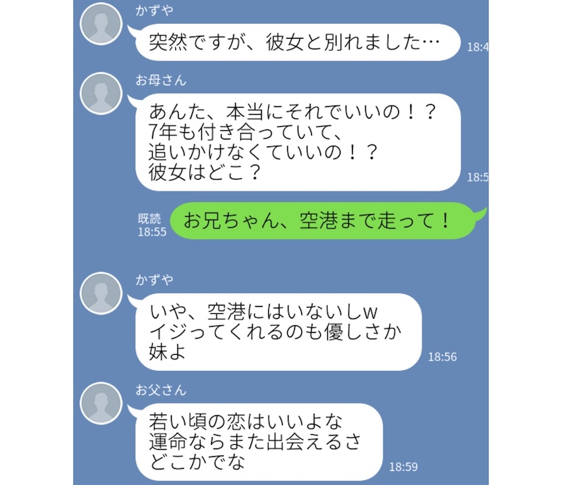「家族の誰かが負った傷は、みんなで癒す!」というのも、仲良し家族LINEのあるあるでしょう。こちらの家族は、お兄さんが7年も付き合った彼女との別れをカミングアウト。それに対して、お母さんが「今すぐ追いかけろ! それが本心か!」と、激励!