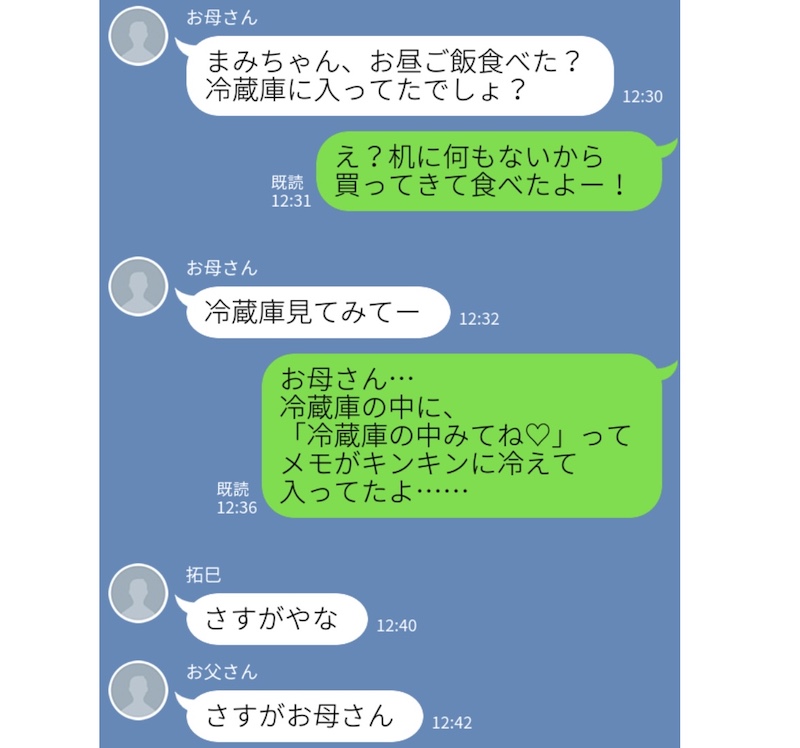 「お母さんが天然」というご家庭は多いですが、家族LINEでも、お母さんの天然ネタを家族が楽しみにしているというあるあるです。こちらのお母さんは娘のために昼食を作って冷蔵庫に入れておいたそうですが、「冷蔵庫を見てね」と書いた紙まで冷蔵庫で冷やしてしまったそう。