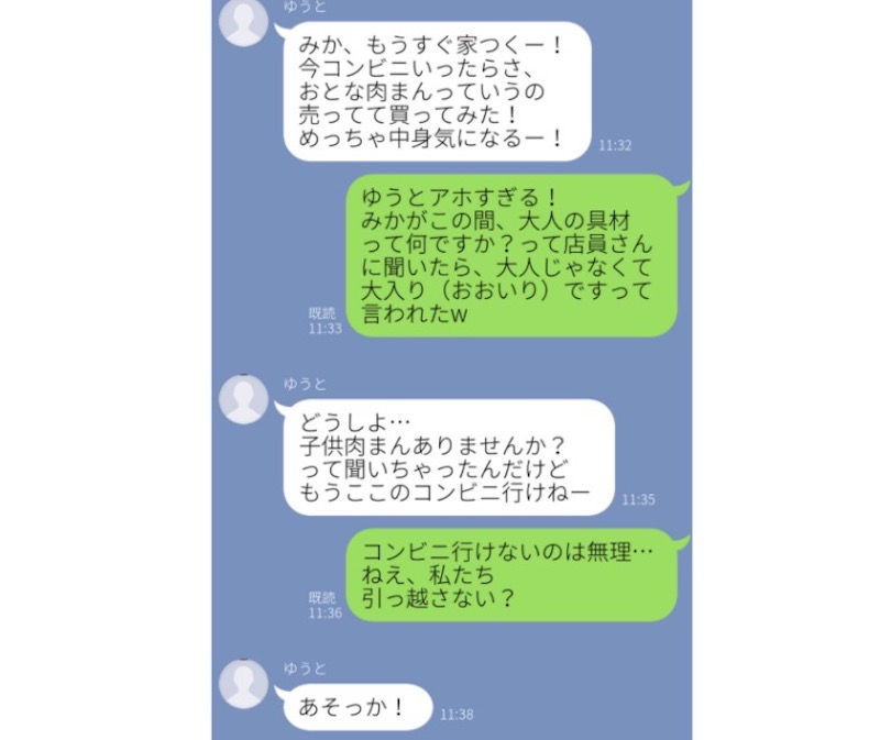 最後にご紹介するこちらのバカップルLINEは、「大入り(おおいり)肉まん」を「大人(おとな)肉まん」と勘違いしてしまった2人の会話です。漢字の読み間違いは確かに恥ずかしいですが、その恥ずかしさだけで「引っ越す」というぶっ飛んだ発想ができる大胆さ! 素晴らしいと思います。
