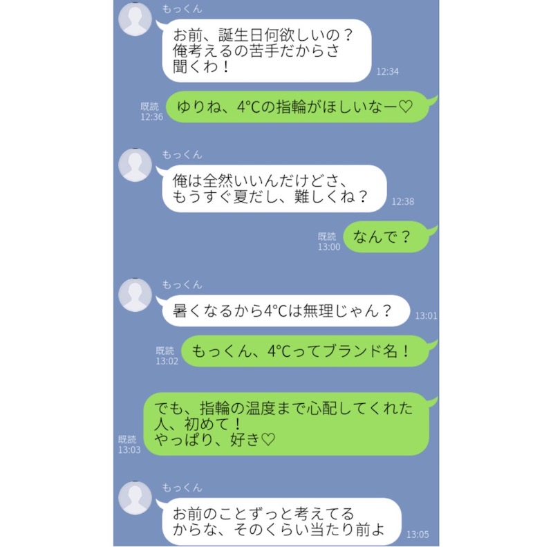 こちらのバカップルLINEでは、ブランドの「4℃」の指輪をおねだりする彼女に対して、指輪の温度を心配してしまう彼氏との会話が繰り広げられています。この彼氏の優しさに、世の男性たちは学ぶものがあるはず!?