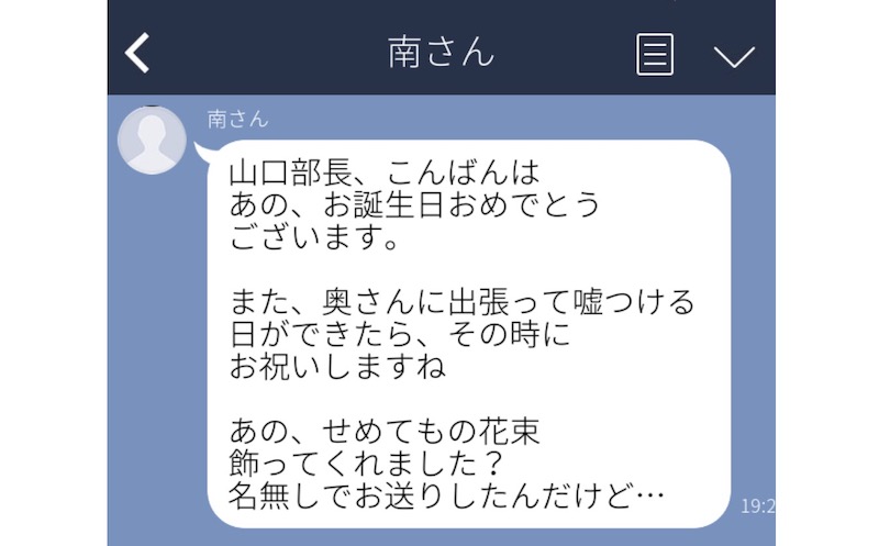 こちらのLINEは、部下と不倫している夫のLINEを妻が覗いた時のもの。そういえば数日前、とても大きくて綺麗な花束が名無しで届いたのだとか。夫の誕生日だったので、名前を入れ忘れた知り合いからのお祝いかなと思い、妻は何も疑わずにリビングに飾ったそうです。