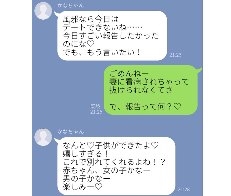 「実は子供ができたよ! 楽しみ♡」と、幸せいっぱいのこちらのLINE。一見、ラブラブな新婚夫婦のような文面ですが、不倫相手の女性との会話だから余計に怖さが倍増しますよね。風邪でデートができなくなった2人ですが、「妻に看病されちゃって抜けられなくて」という夫の文章に、妻は涙が止まらなかったそうです……。