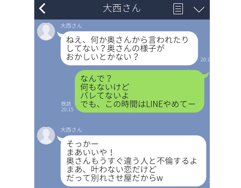 こちらのLINEは、不倫相手の女性から、なんと「奥さんはもうすぐほかの男性と不倫する」という予告のような内容でした。そして、文章の最後には「別れさせ屋」という単語が……。思い起こせば、最近、言い寄ってくる男性が確かにいたのだとか。