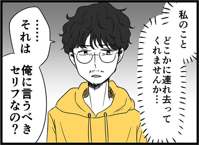 この漫画の主人公・リコちゃんは今の状況をなんとかしたくて、恋人でもない男性に「私を連れ去ってほしい」なんて突拍子もないことを言い出してしまいました。それでいいのかリコちゃん!? 彼女の人生を変えるのに必要なものとは一体……?