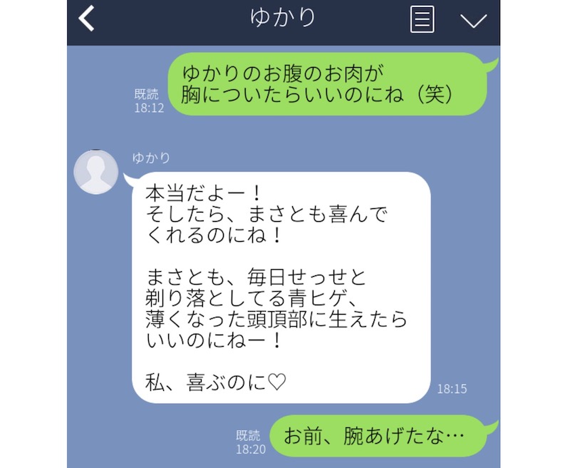 彼氏から彼女へ冗談で「お腹の肉が胸についたらいいのにな」というメッセージを送ったところ、怒らずにいったん同調した彼女。ところが、そのすぐ後に「毎日剃り落としてる青ヒゲも、頭頂部に生えたらいいのにね」という返しがきたそうです。