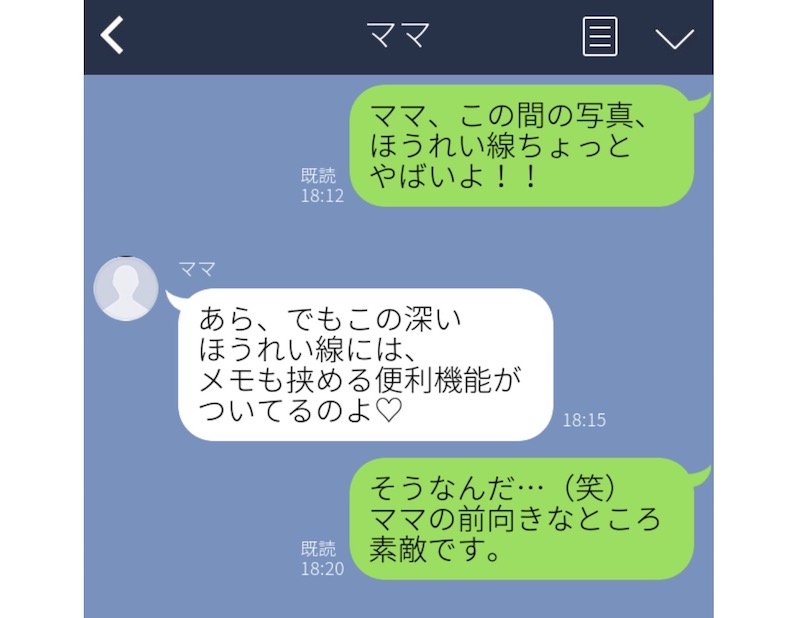 家族の集合写真を見た娘さんから「ママのほうれい線、やばいよ」というLINEを入れたところ、ママから「この深いほうれい線は、メモも挟めて便利なの」という返事がきました。