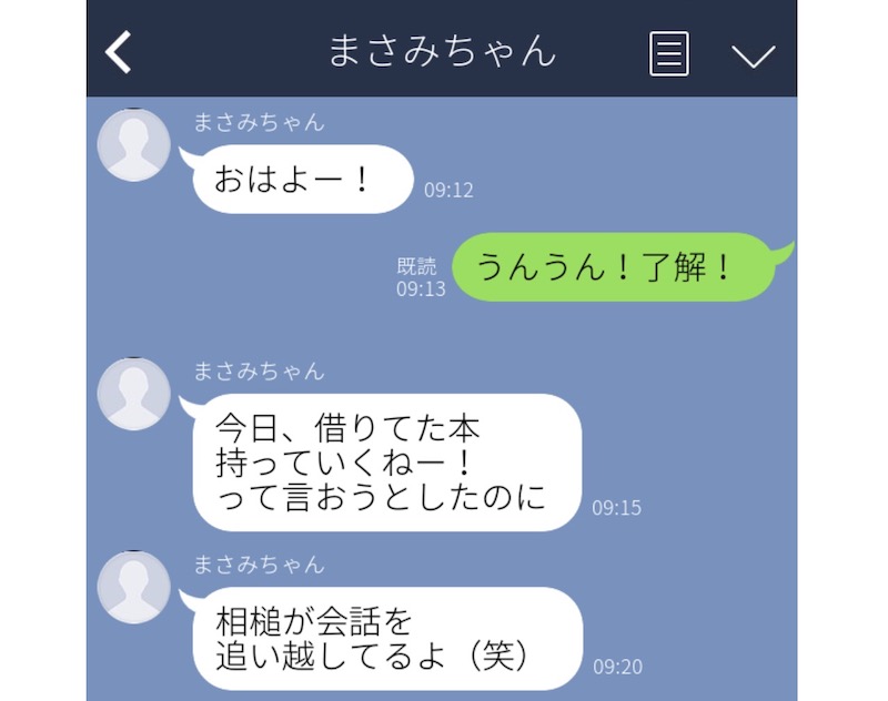 借りていた本を持っていくことを伝えたかったのに、伝える前に相槌された友達は「相槌が会話を追い越してるよ」と一言。咄嗟にこんな回答ができる友達に、思わず感心してしまいますね。