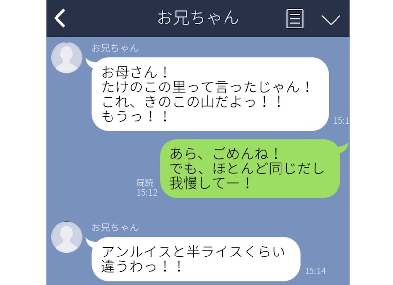 こちらのLINEは息子さんからお母さんに、おやつに「たけのこの里」を買ってきてと頼んだ際の会話です。お母さんは、間違えて「きのこの山」を買ってきてしまったそうで、「ほとんど同じだから許して」と送ったところ、こんな返しがきたのでした。