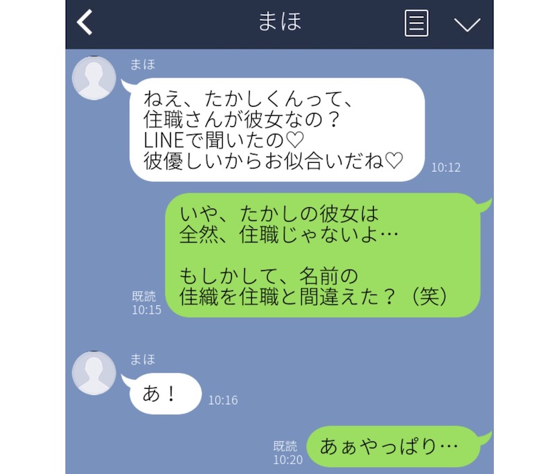 カップル共通の友人男性から、恋人の話をLINEで聞いた彼女。さっそく彼氏に報告した内容が、「たかしくん、住職と付き合ってるんだって! お似合いだね♡」というものでした。彼氏は、最初は「?」となったそう。