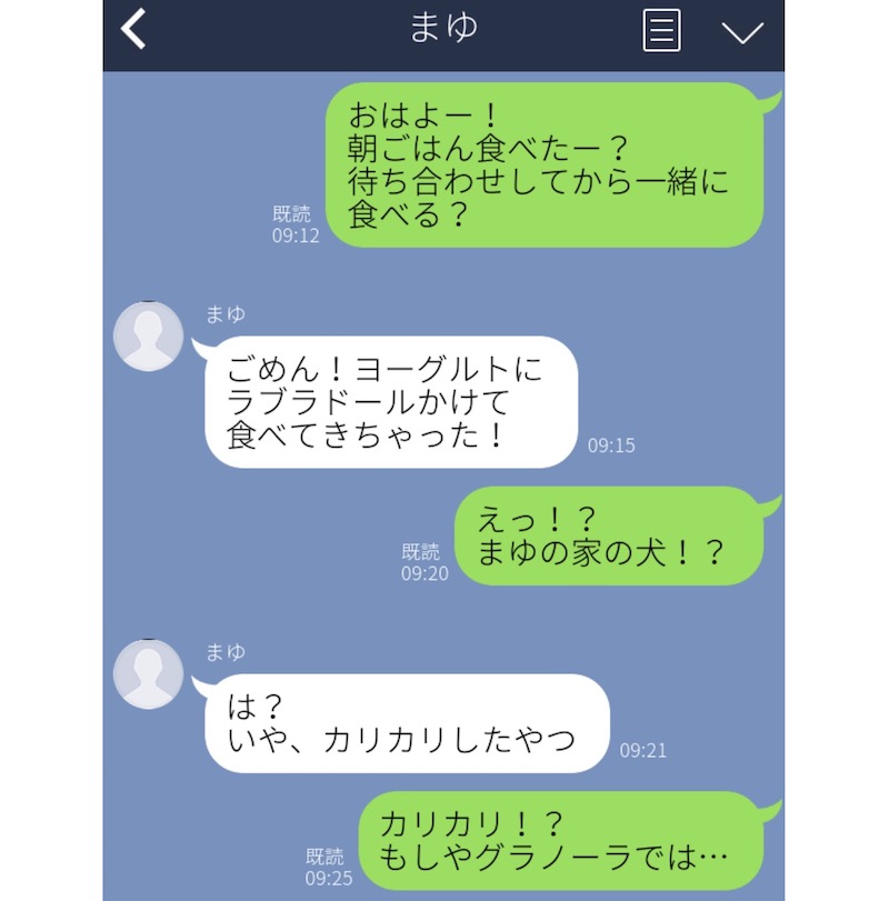 朝早くからデートの約束をしていた、こちらのカップル。天然彼女に「朝ごはん食べた?」と聞く彼氏に対して、「ヨーグルトにラブラドールをかけて食べた」と答えた彼女。彼女の家では犬を飼っているので、一瞬「えっ!?」となった彼氏。