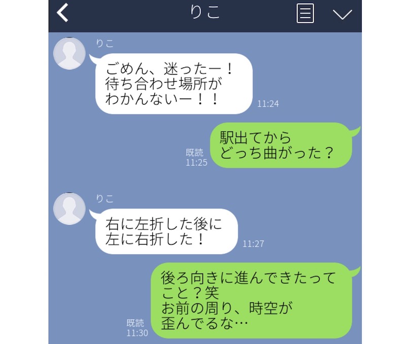 こちらの彼氏は、デートで彼女と待ち合わせをしていたところ、彼女から道に迷ったとの連絡が。駅から近い場所だったので、駅からどっちに曲がったかを聞いたところ、「右に左折して、左に右折した」との回答が。