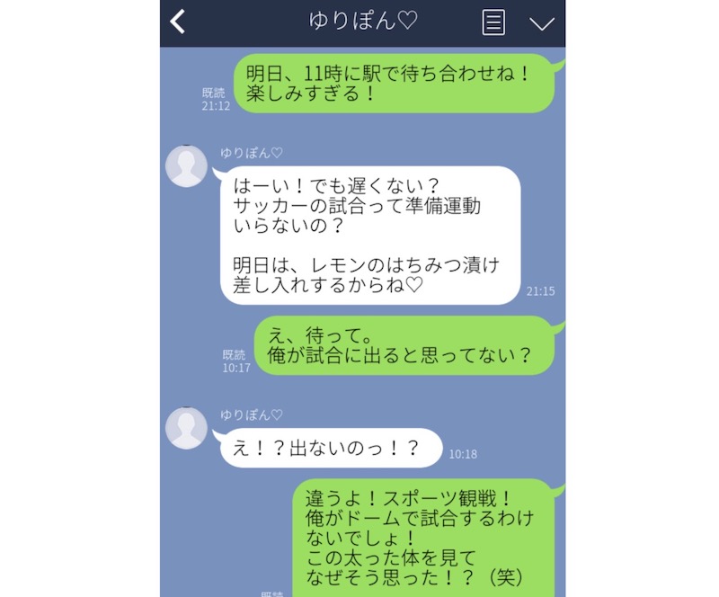 こちらのカップル、彼氏は体重90kg近いぽっちゃり体型です。彼氏はサッカー観戦が趣味で、この日ははじめて彼女をサッカー観戦に誘いました。すると、彼女から「レモンのはちみつ漬け差し入れするね♡」との返事が。