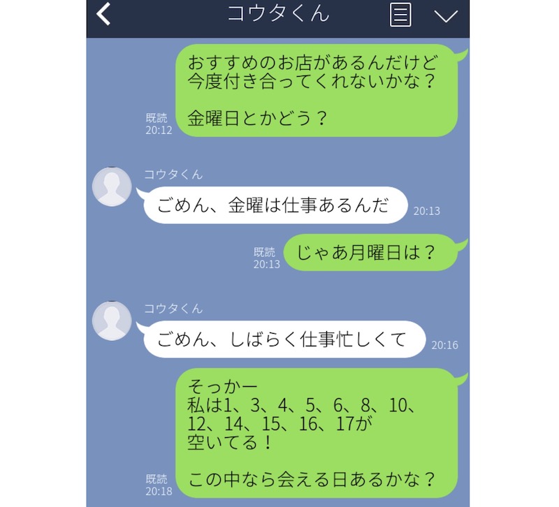 こちらの女性は、勇気を振り絞って片思い中の彼をデートに誘いました。でも、予定が合わないとの返事があったため、良かれと思って可能な日程を羅列し、一気に送ったのです。しかし、これが彼には、怖い“女の執念”に見えてしまったよう。この後から、まったく連絡が取れなくなってしまったそうです。