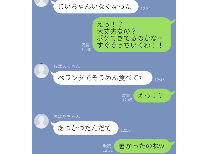 こちらは、LINEを覚えたてのおばあちゃんから届いたお騒がせLINEです。「じいちゃんがいなくなった」というメッセージに慌てたお孫さん。年が年だけに「もしかしてボケちゃったのかな……」と心配し、慌てて祖母の家に直行しようとしたところ、またLINEの通知音が。