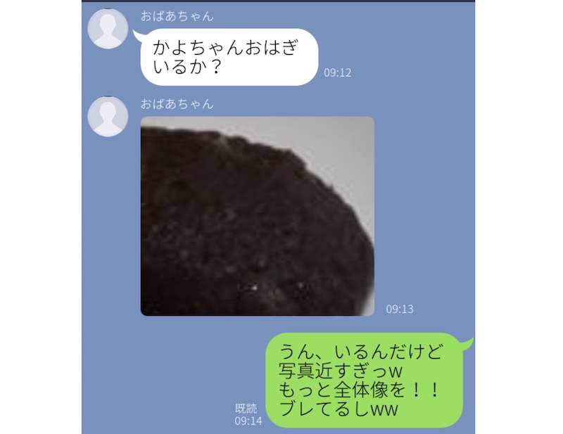 こちらのお孫さんは、おばあちゃんがLINEデビューしたばかりで、時々やりとりを楽しんでいるそう。ある日、得意の手作りおはぎを作ったおばあちゃんからLINEが届いたのですが、添付されたおはぎの写真が残念なことに……。(笑)