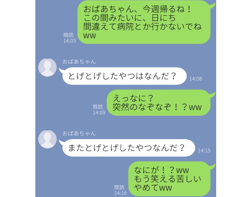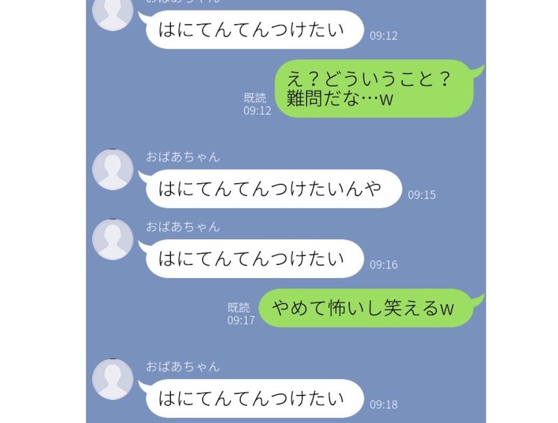 こちらは、ちょっと恐怖のLINE……。おばあちゃんから突然届いたLINEには、「はにてんてんつけたい」という謎の呪文が。何回も送ってくるのでだんだん面白くなってきて、お孫さんは大爆笑。