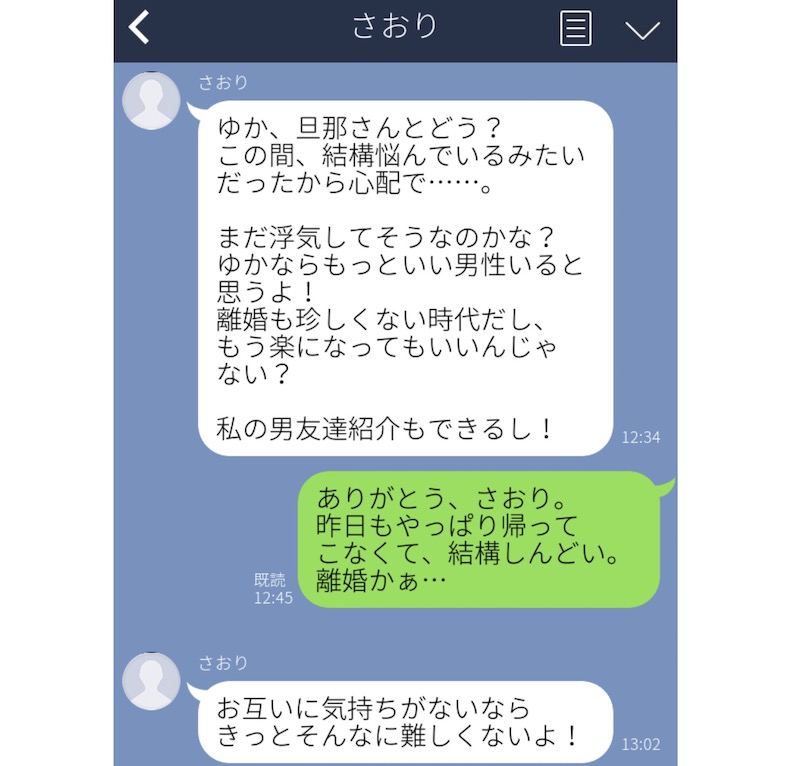 こちらの女性は、友人に夫の浮気疑惑を相談していたそうです。その友人からは、ことあるごとに、離婚を勧めるLINEが入っていたとか。最初は、心配してくれていると思っていたそうなのですが、実はなんと、浮気相手はこの友人だったことが判明!