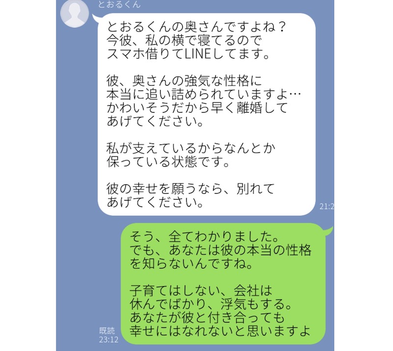 こちらの女性は、ある日、夫のスマホを使って浮気相手と名乗る女性からのLINEが届きました。しかも「あなたの強気な性格に彼は追い詰められている。別れてあげて!」というなんとも無神経な内容が書かれていたそう。