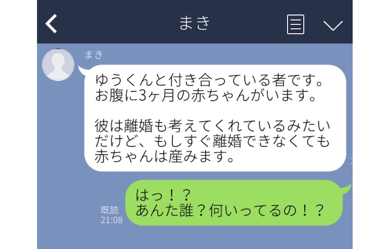 こちらも、なかなかの衝撃LINEです。ある日、サレ妻のスマホに届いたLINEには、「お腹にあなたの夫との赤ちゃんがいます。離婚が遅れても赤ちゃんは産みます」とありました。こんなLINEが突然届いたら、たまりませんよね!