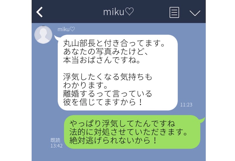 こちらの女性は、夫が会社の部下と浮気をしていたことを突然のLINEで知りました。しかもそこには「写真を見たけどおばさんですね。彼が浮気したくなる気持ちがわかる」と……。これは、ひどいですね。
