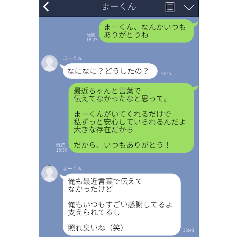 そこで、あらためて感謝を伝えてみてはいかがでしょうか。ポイントは、当たり前のことに対する感謝を伝えること。具体的に「◯◯してくれた」という感謝ではなく、存在についてや、相手に支えられていることなどに対する感謝を伝えてみてくださいね♡