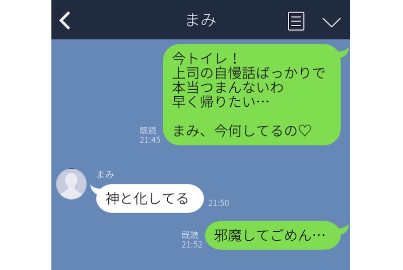 こちらの男性は、仕事の飲み会で上司の自慢話を延々と聞かされることになり、癒しを求めてトイレから妻にLINEを送りました。「今何してるの?」と聞くと、まさかの「神と化してる」との返信が……。
