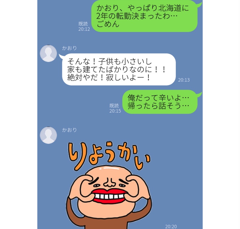 こちらの男性は、北海道への2年間の転勤が決まったことを妻にLINEで送ったそうです。小さな子供がいるし、家を建てたばかりだったので、とても寂しがって混乱する妻……。重たい空気で、「家に帰ったら話そう…」と伝えました。