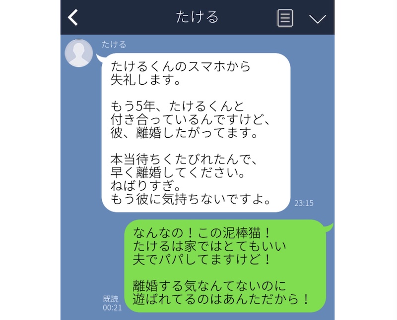 人の旦那を奪っておいて、「待たせすぎ」とは本当に驚愕発言ですね! 宣戦布告とも取れる、生々しいLINEでした。