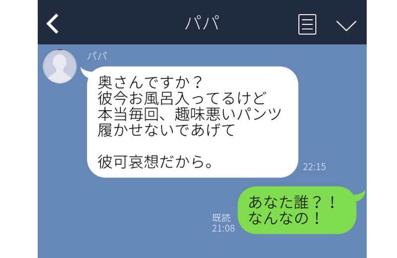 こちらの不倫相手は、旦那のスマホを使ってある日突然連絡してきたといいます。しかも、「彼に趣味が悪いパンツを履かせないであげて。可哀想」という挑発的な言葉に、震えるほど怒りを感じたそう。