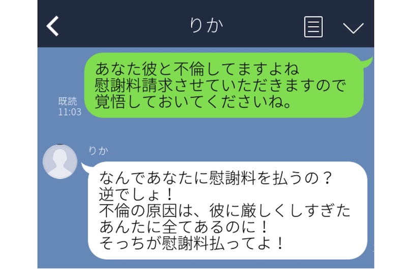 こちらの女性は、旦那の不倫に気づいていて、LINE上の証拠もしっかり撮影。そのうえで、不倫相手にLINEで宣戦布告したといいます。それに対する返信が「なんで慰謝料が必要なの? 不倫の原因は全てそっちにあるから、慰謝料はそっちこそ払って」というなんとも自分勝手な言葉でした。
