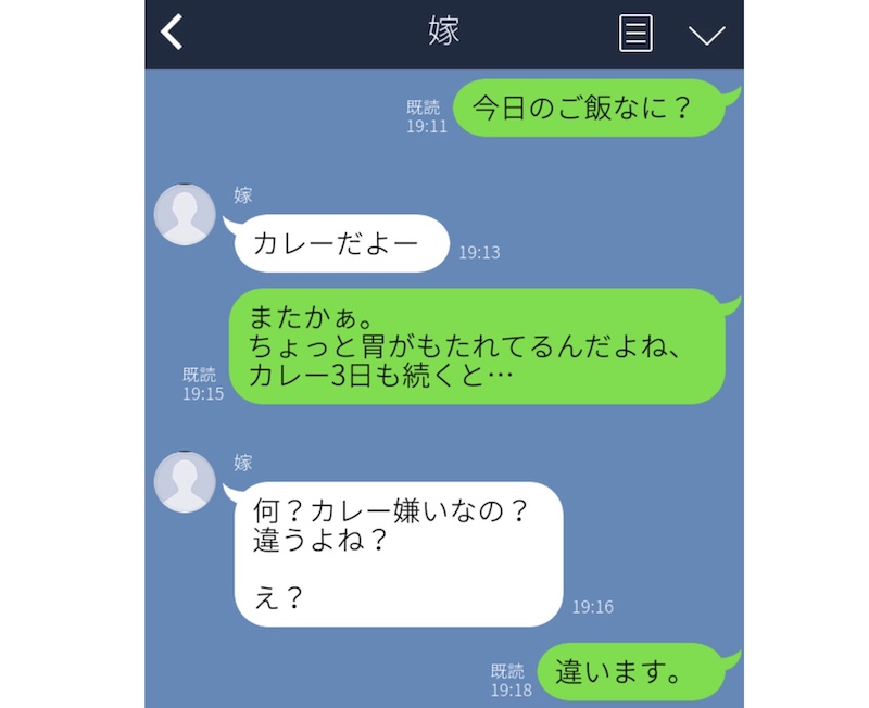 そのことをLINEで指摘すると「カレーが嫌いなの? 違うよね?」と、ひと言。なんだか破壊的な恐怖のパワーが宿っていますよね……。あまりの恐怖に、夫は「違います」と返すのが精一杯だったそうです。